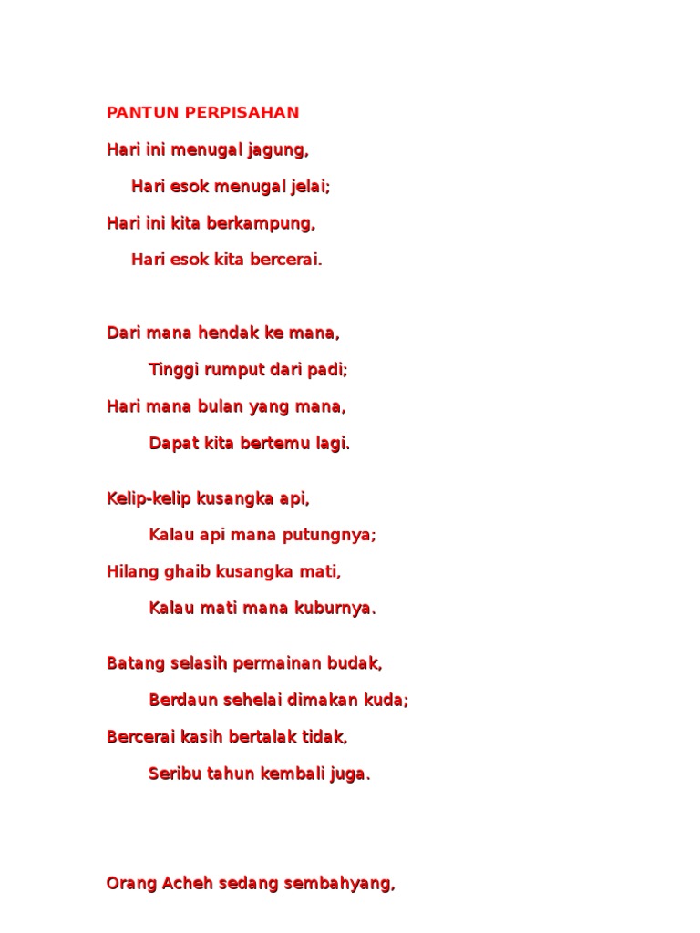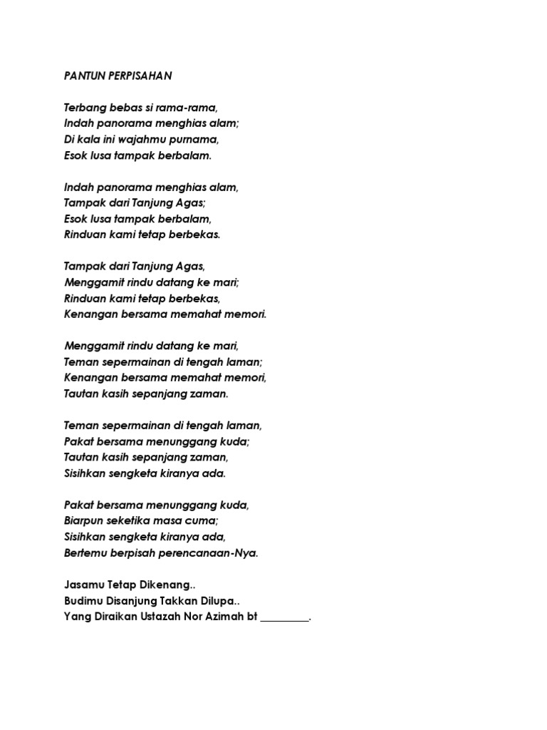 Pantun dan puisi perpisahan berikut saya dapatkan dari berbagai sumber dan blog yang terpercaya. Momen perpisahan bukan hanya sering terjadi di sekolah atau pun saat berpacaran. Telus kata buat anak dara.