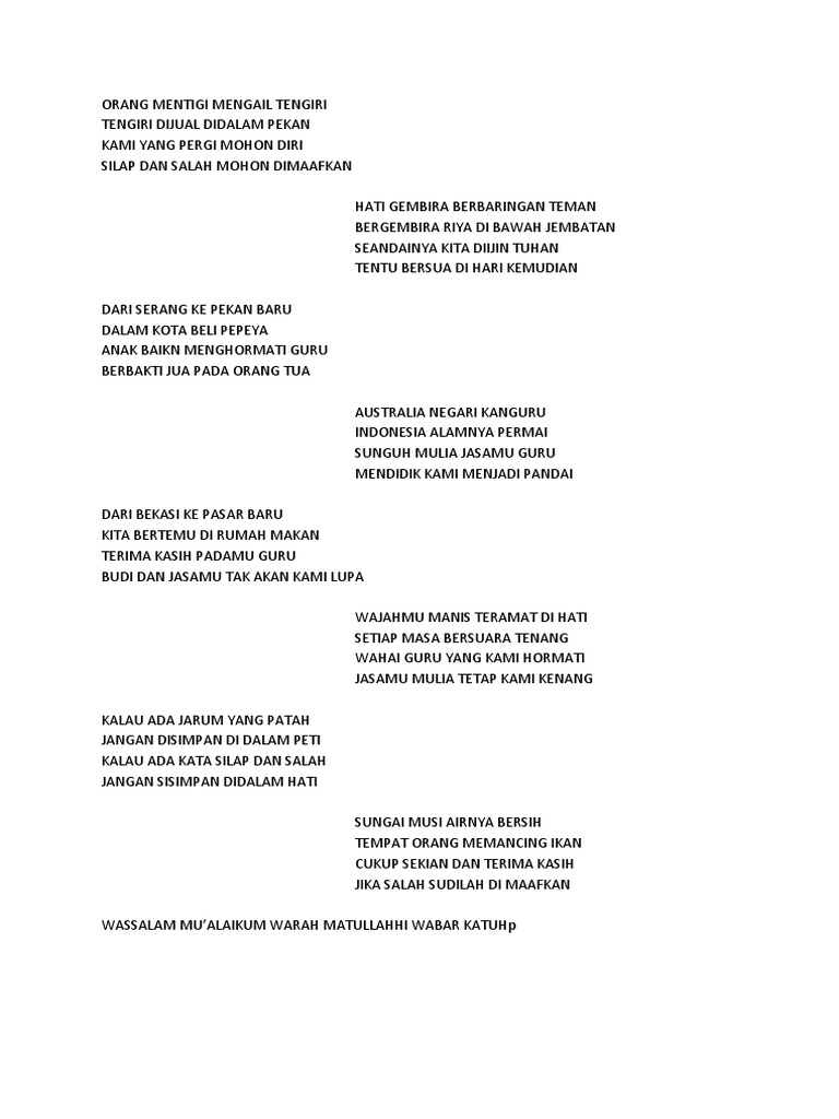 Perpisahan memang tak bisa dihindari cepat atau lambat dan dengan berbagai sebab. Contoh Pantun Pendidikan Bagian 1 1 Pisau di dapur harus diasah Supaya daging dapat dicacah Belajar tidak kenal lelah Niscaya akan mendapat faedah 2 Begitu luas lautan Yang harus kita selami Begitu luas wawasan Yang harus kita dalami 3 Ayam enak jika dibakar Namun lebih mantap dijadikan pepesan Guru jangan hanya pandai mengajar. Pantun Perpisahan Lengkap dan Penuh Arti.